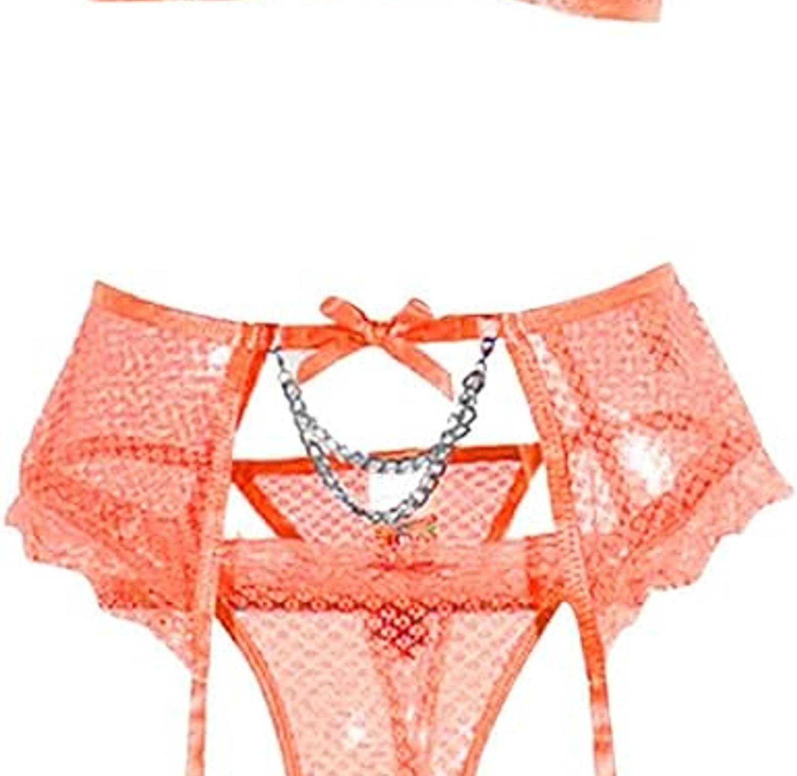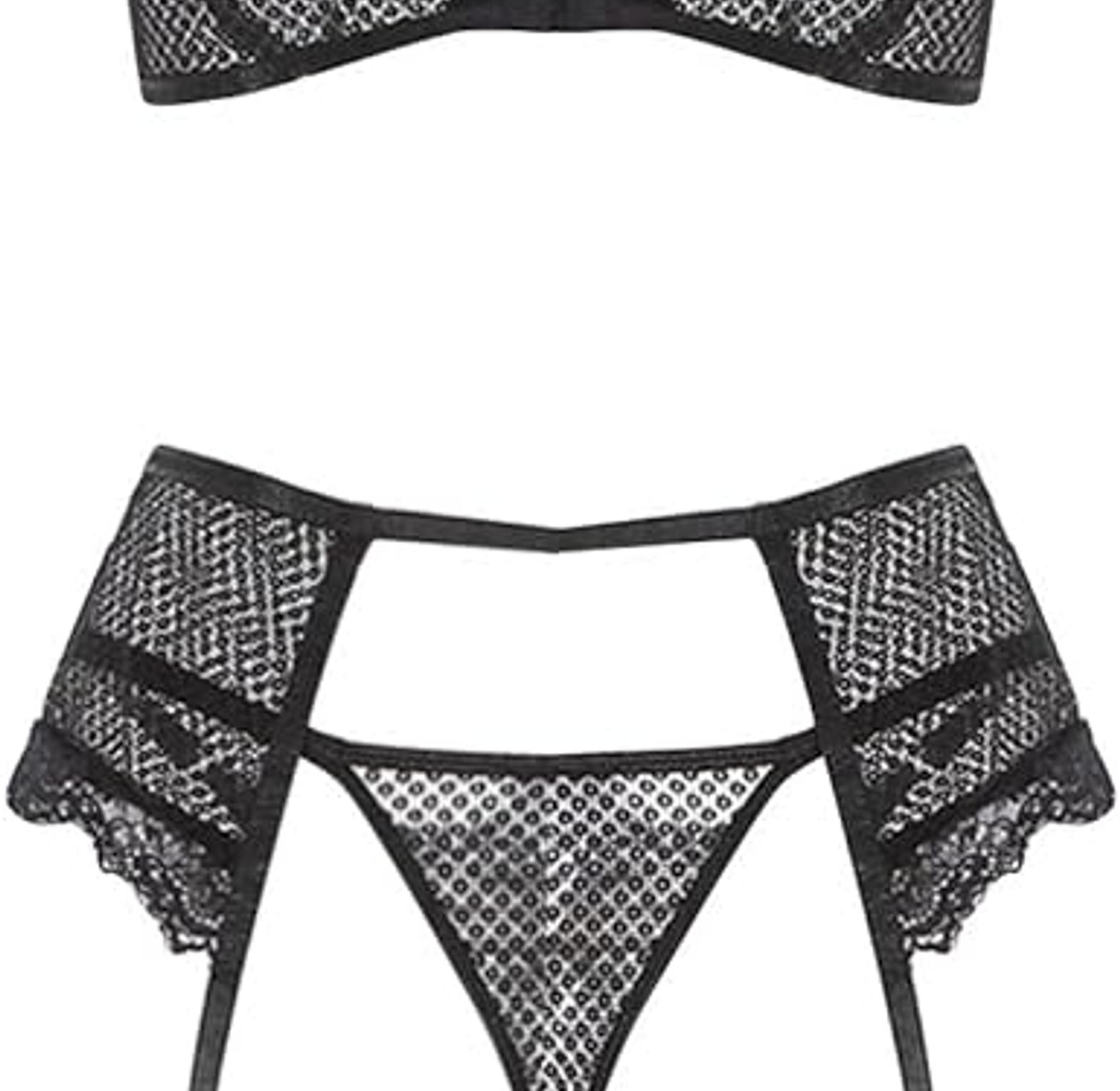 This 3-piece lingerie set features a lace bra, matching thong, and garter belt with mesh patchwork and chain accents for a daring, high-impact look.