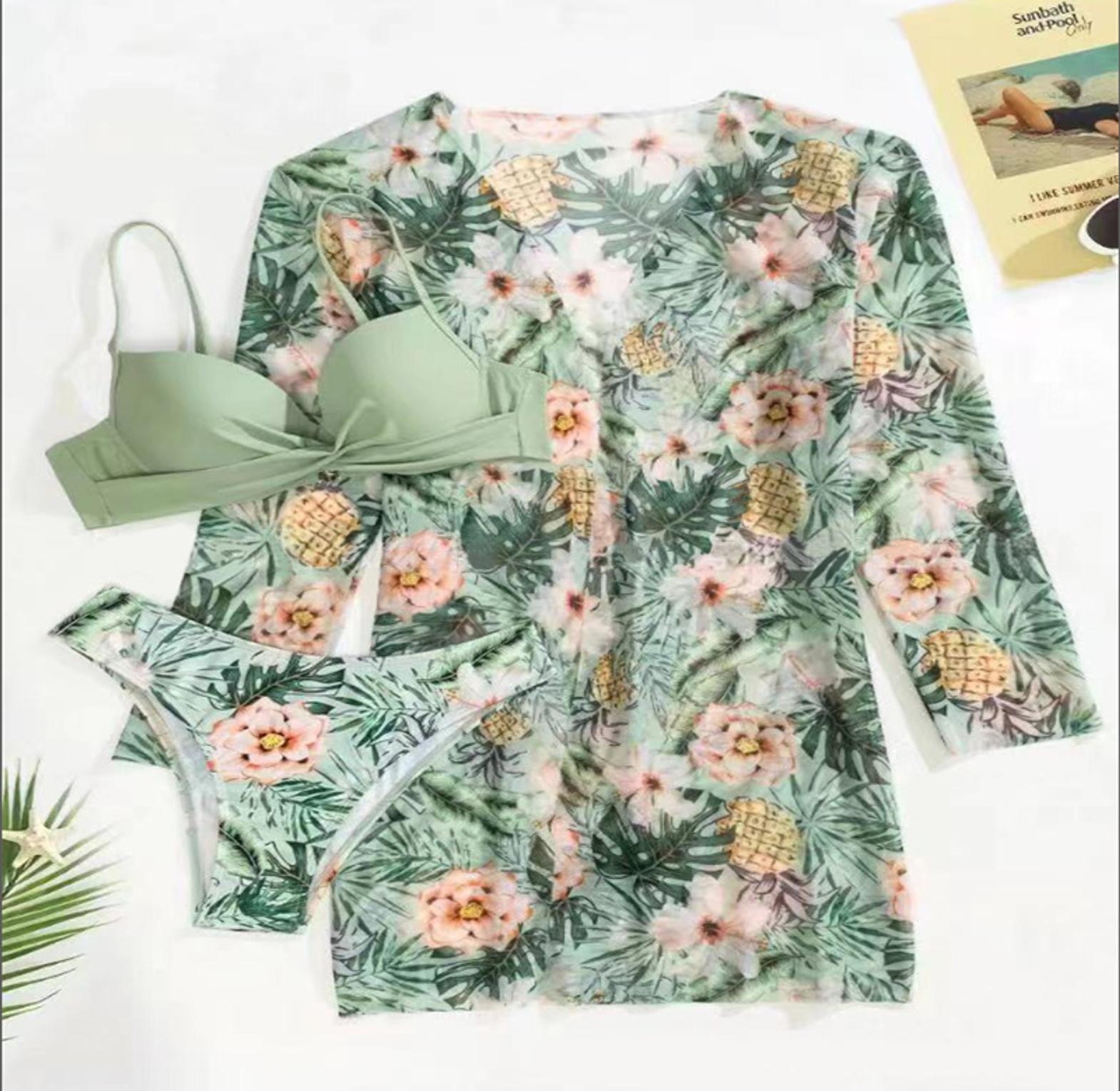 This 3-piece set includes a push-up bikini with tropical plant prints and a matching lightweight kimono, blending support, style, and summer elegance.