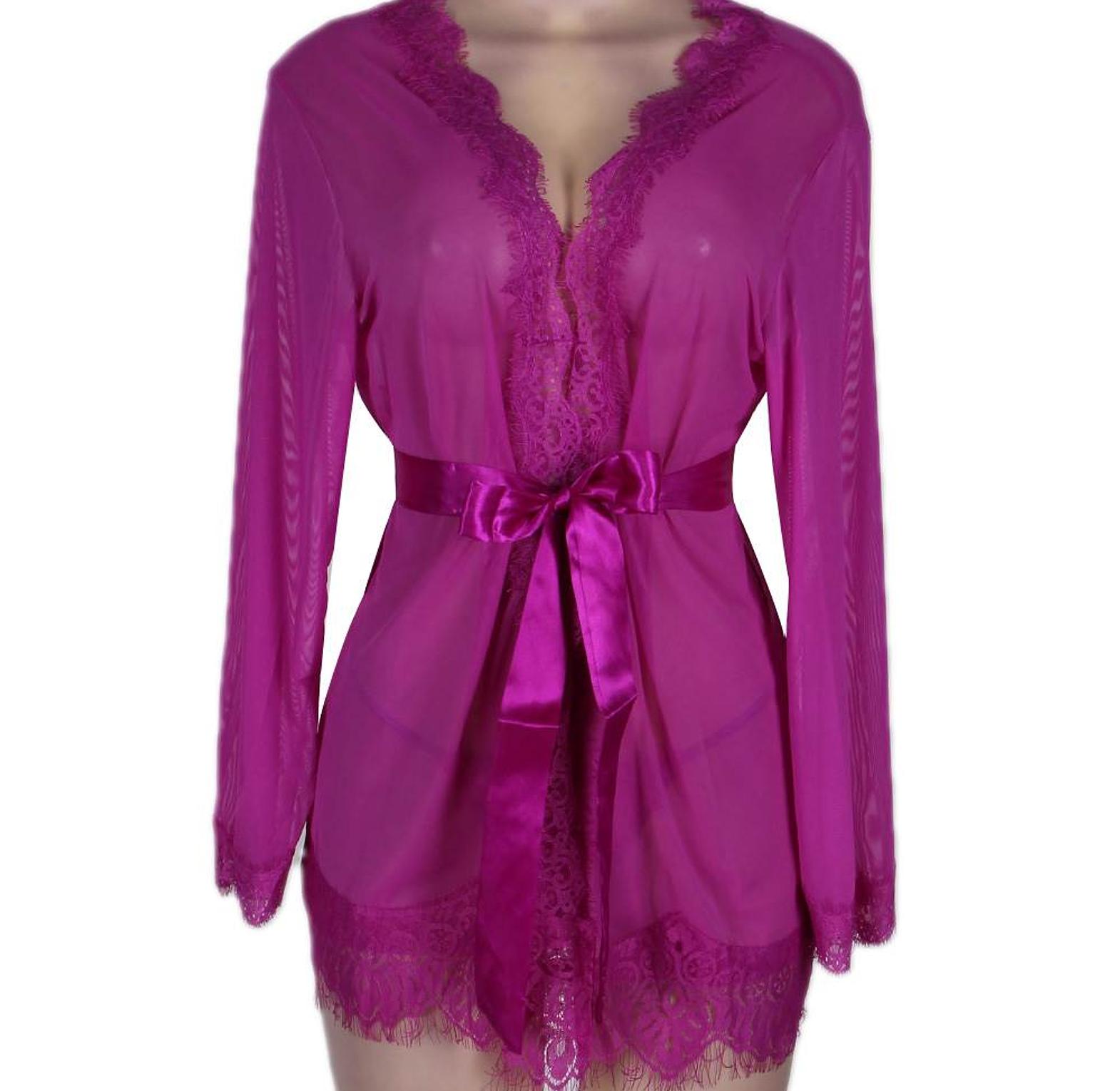 This sheer lace-trimmed sexy robe features a flowing silhouette and matching belt, perfect for layering seduction and elegance.