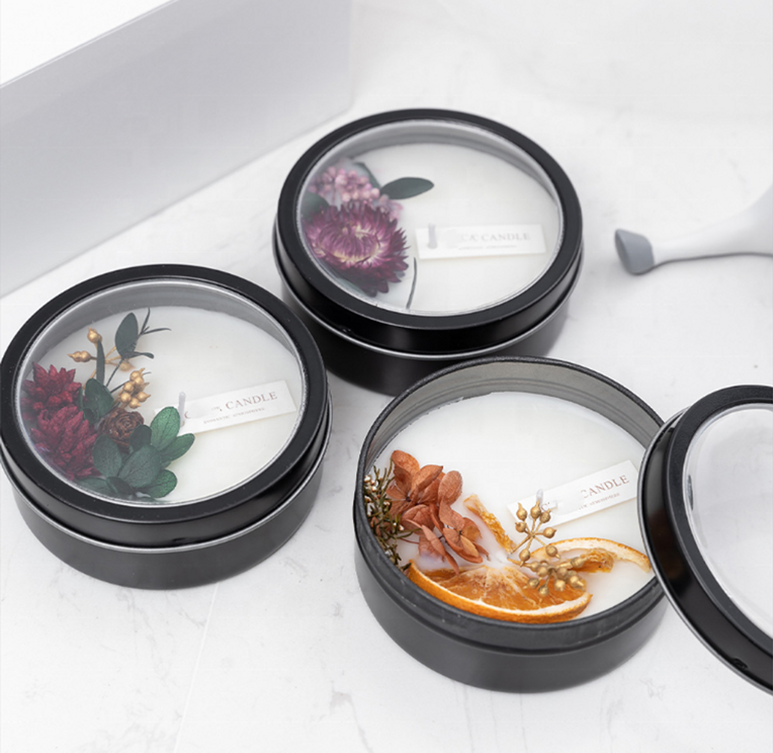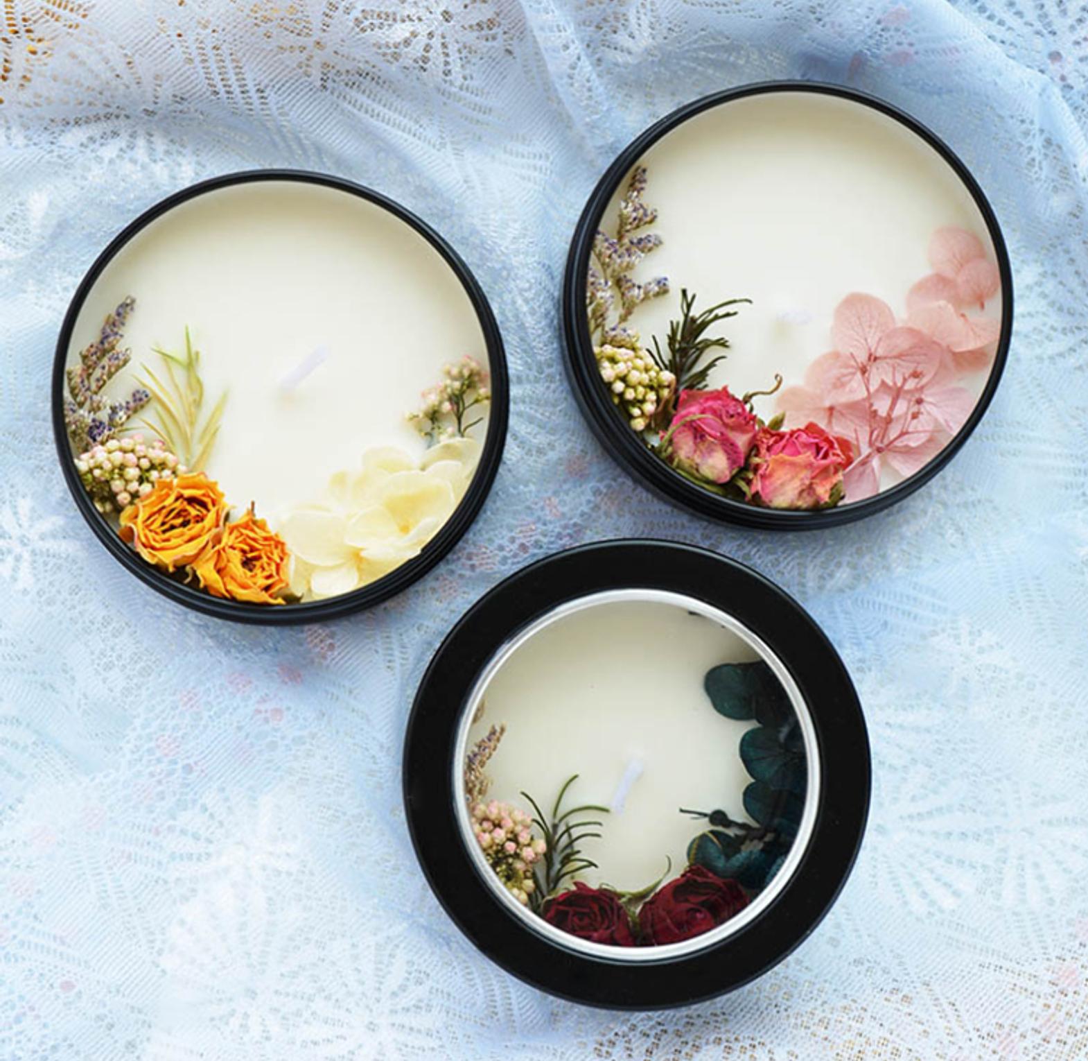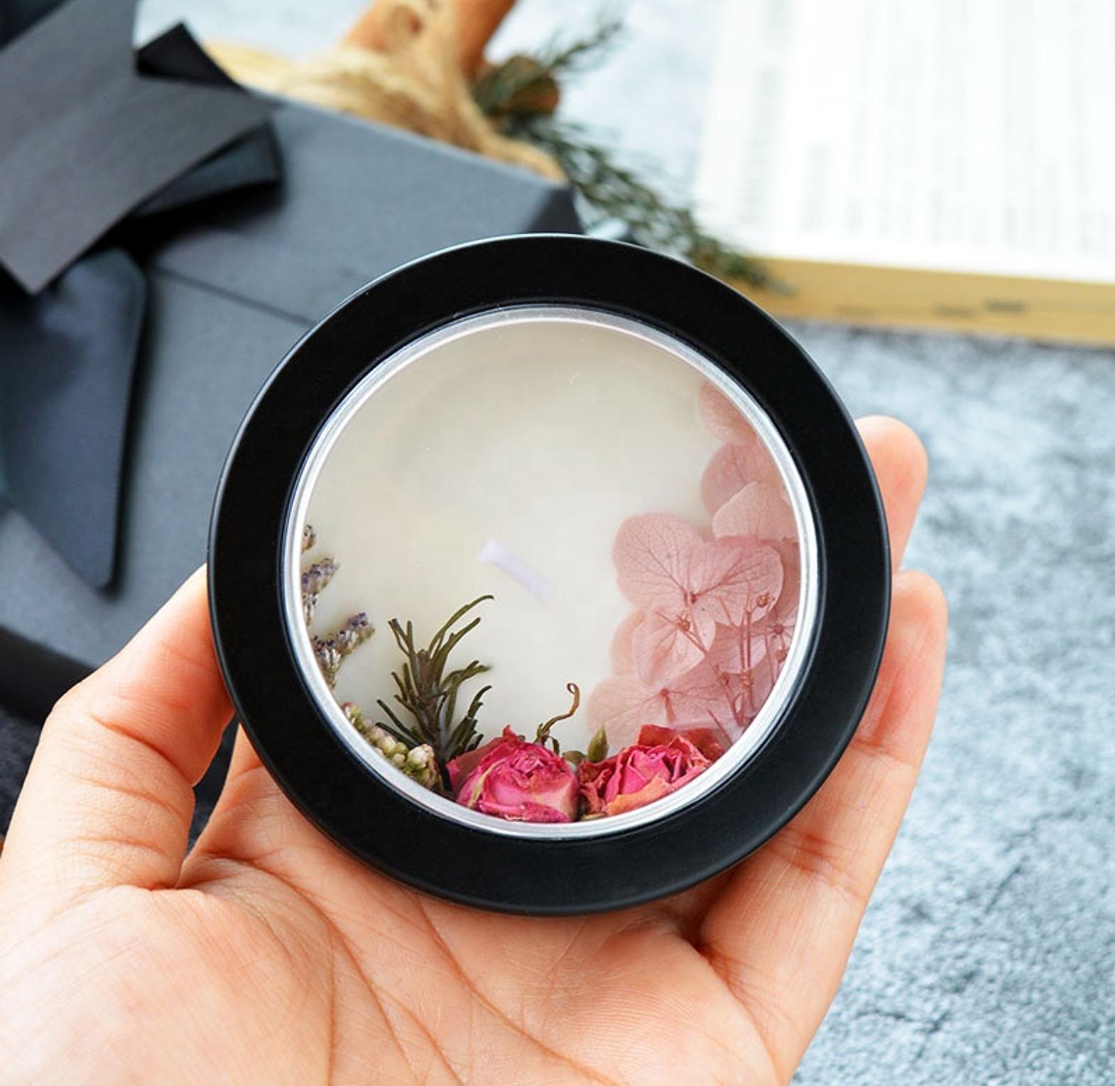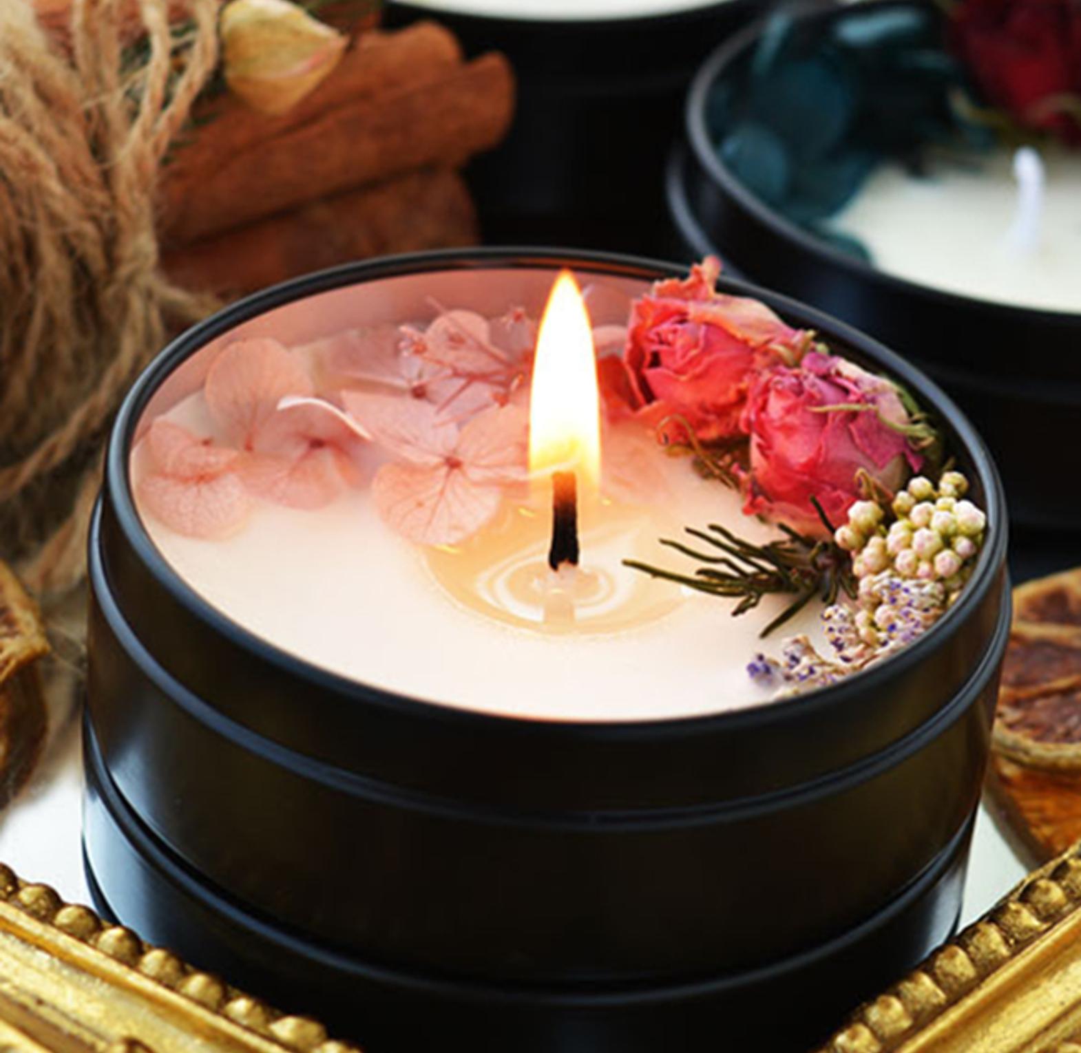 This elegant black tin candle is infused with dried fruit and floral botanicals, offering a rich, layered aroma from clean-burning soy wax.