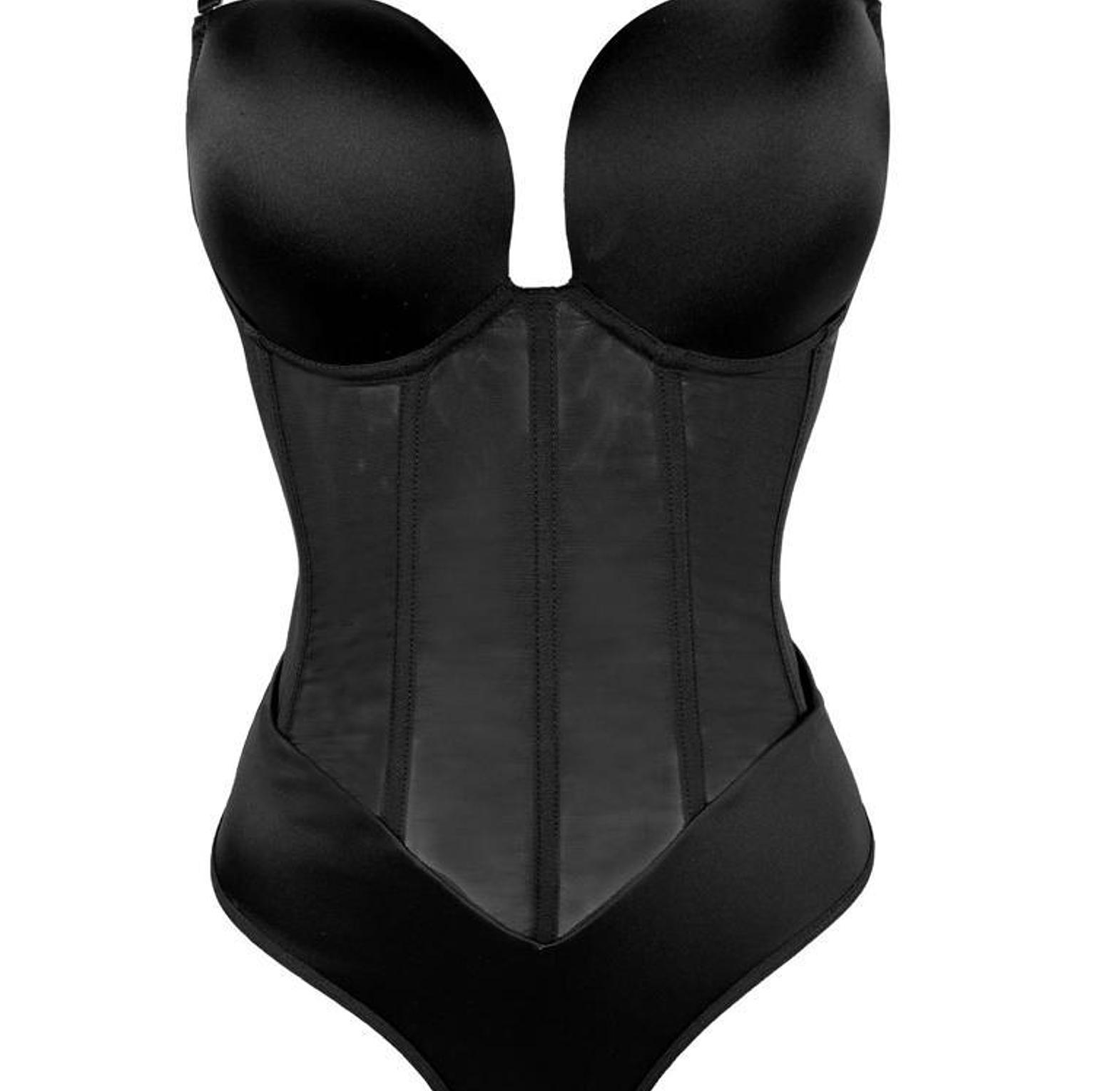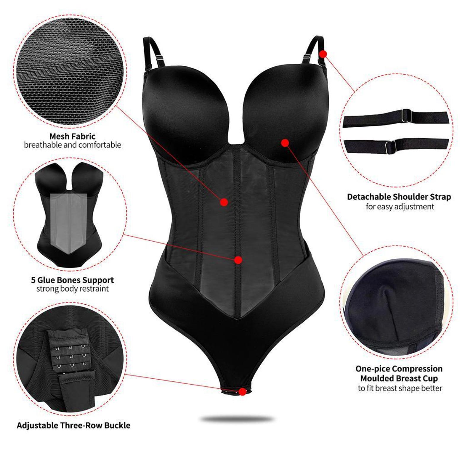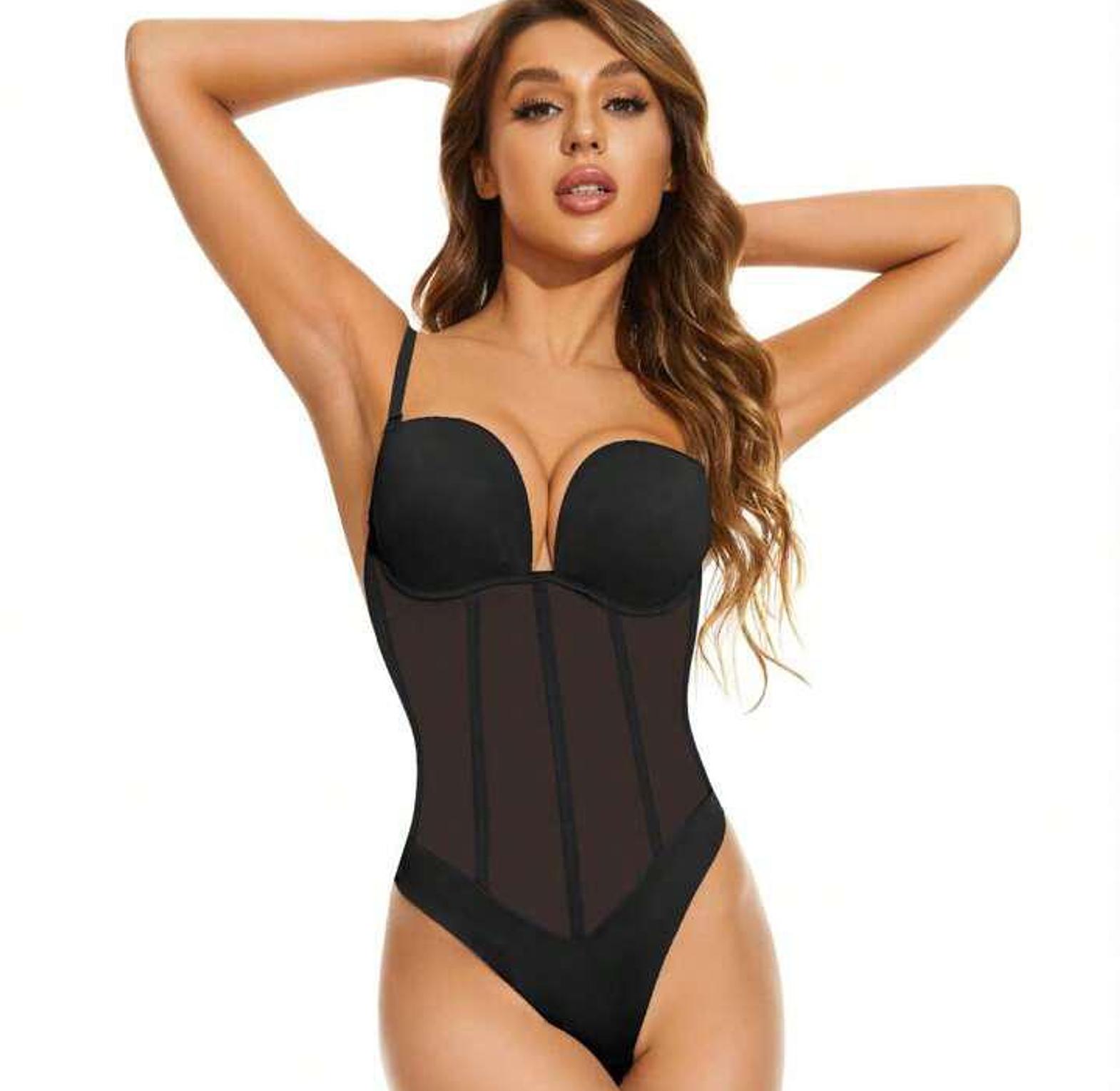 Crafted for confidence and versatility, this slimming bodysuit shapewear features a deep plunge neckline and backless design perfect for low-cut dresses, evening wear, or bridal gowns. The high-compression fabric smooths and shapes the waist and abdomen, while the built-in push-up structure enhances the bust without needing a bra. Its thong back ensures no visible panty lines, making it ideal for sleek silhouettes and fitted outfits. Adjustable straps and hook closures provide a secure, custom fit that stays in place comfortably throughout the day or night. Whether you're dressing for a wedding, red carpet event, or just want to feel sculpted and secure, this shapewear offers discreet support with striking results.