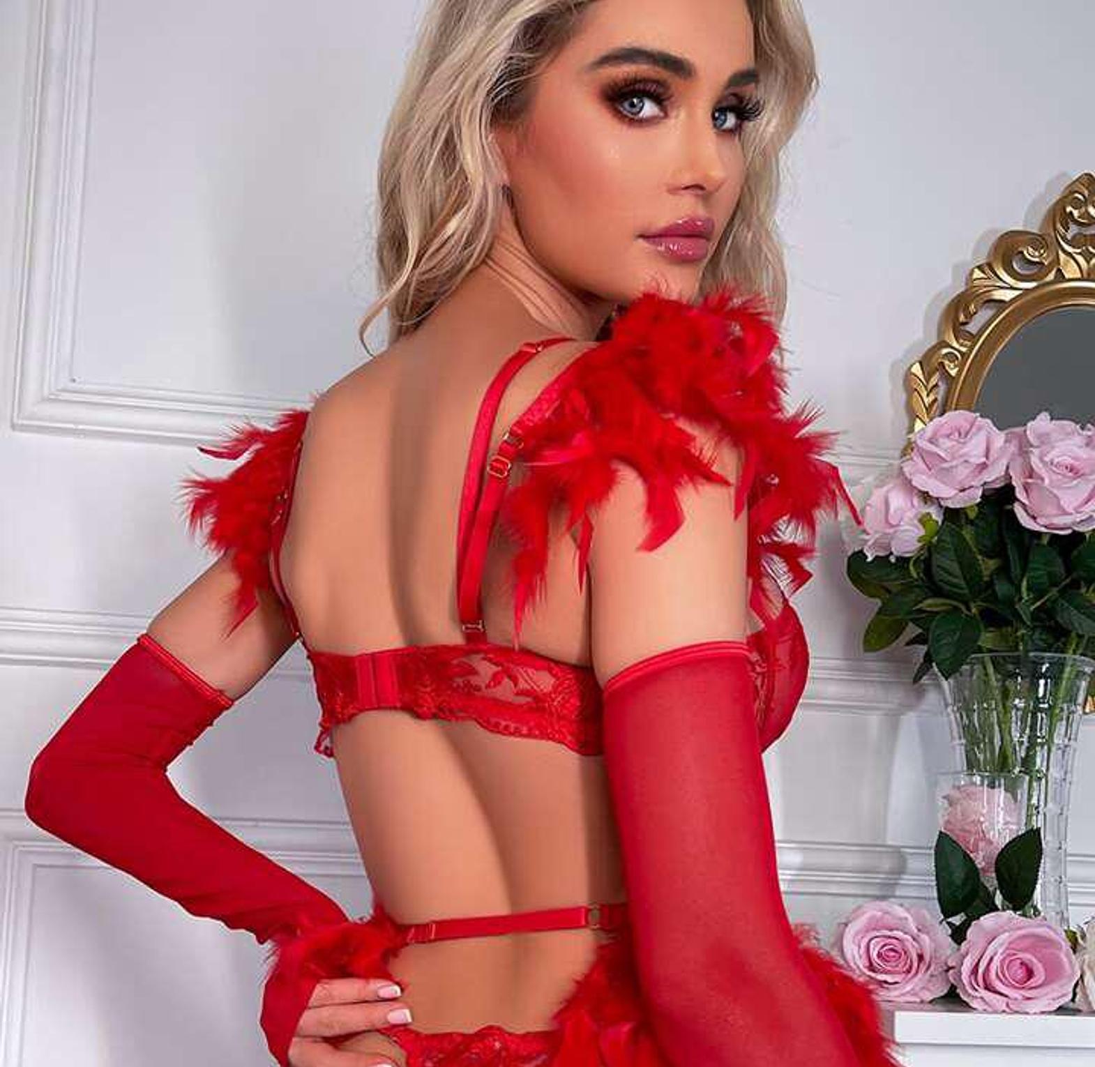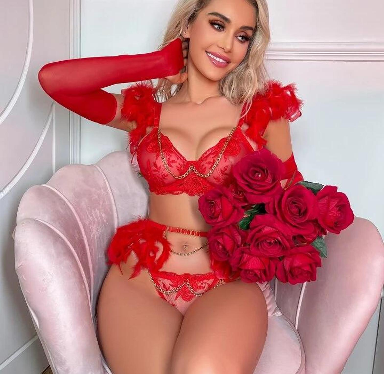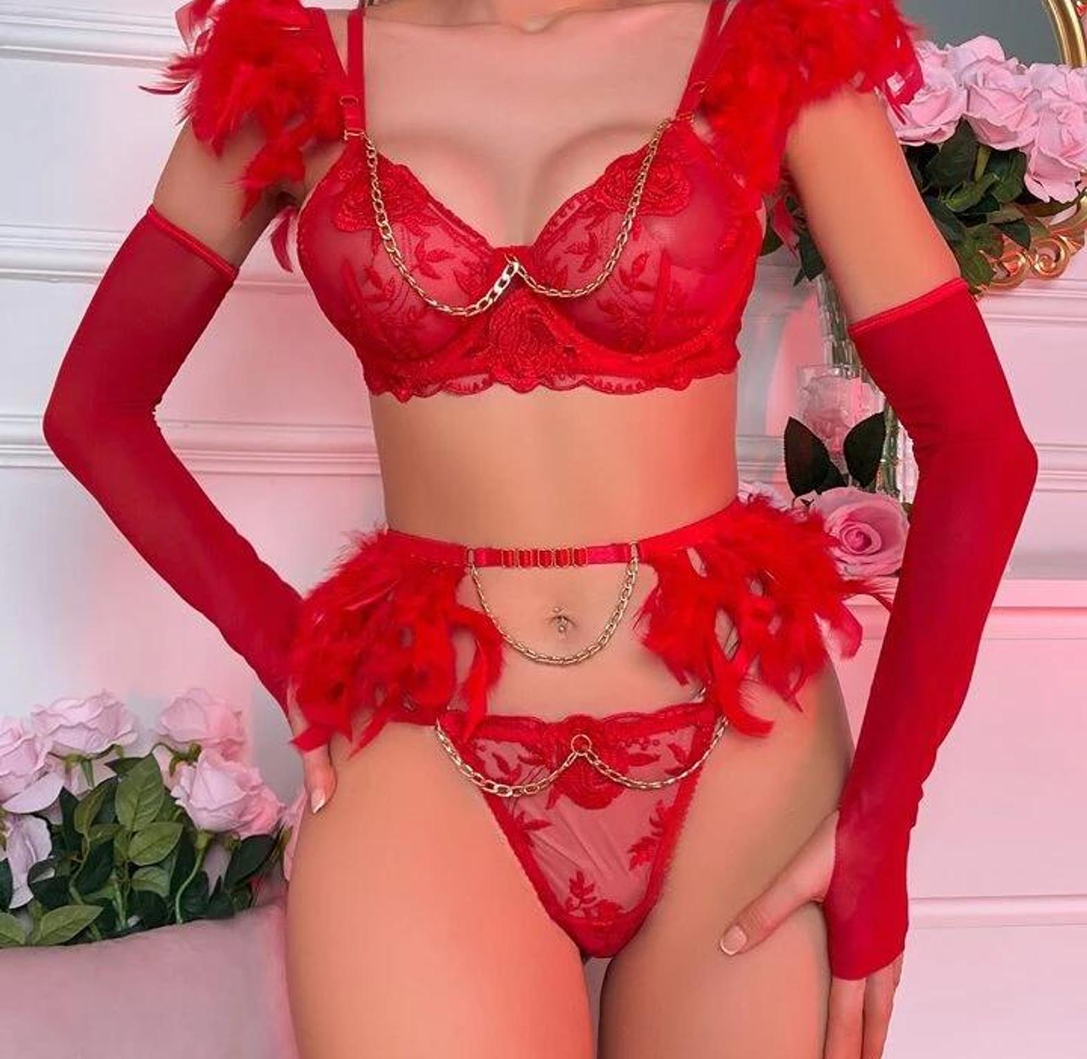 This floral lace lingerie set features delicate chain accents, a soft diffuse finish, and matching gloves—crafted for an unforgettable, high-impact boudoir look.