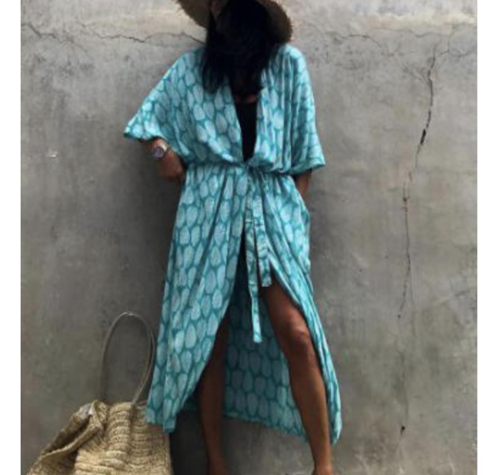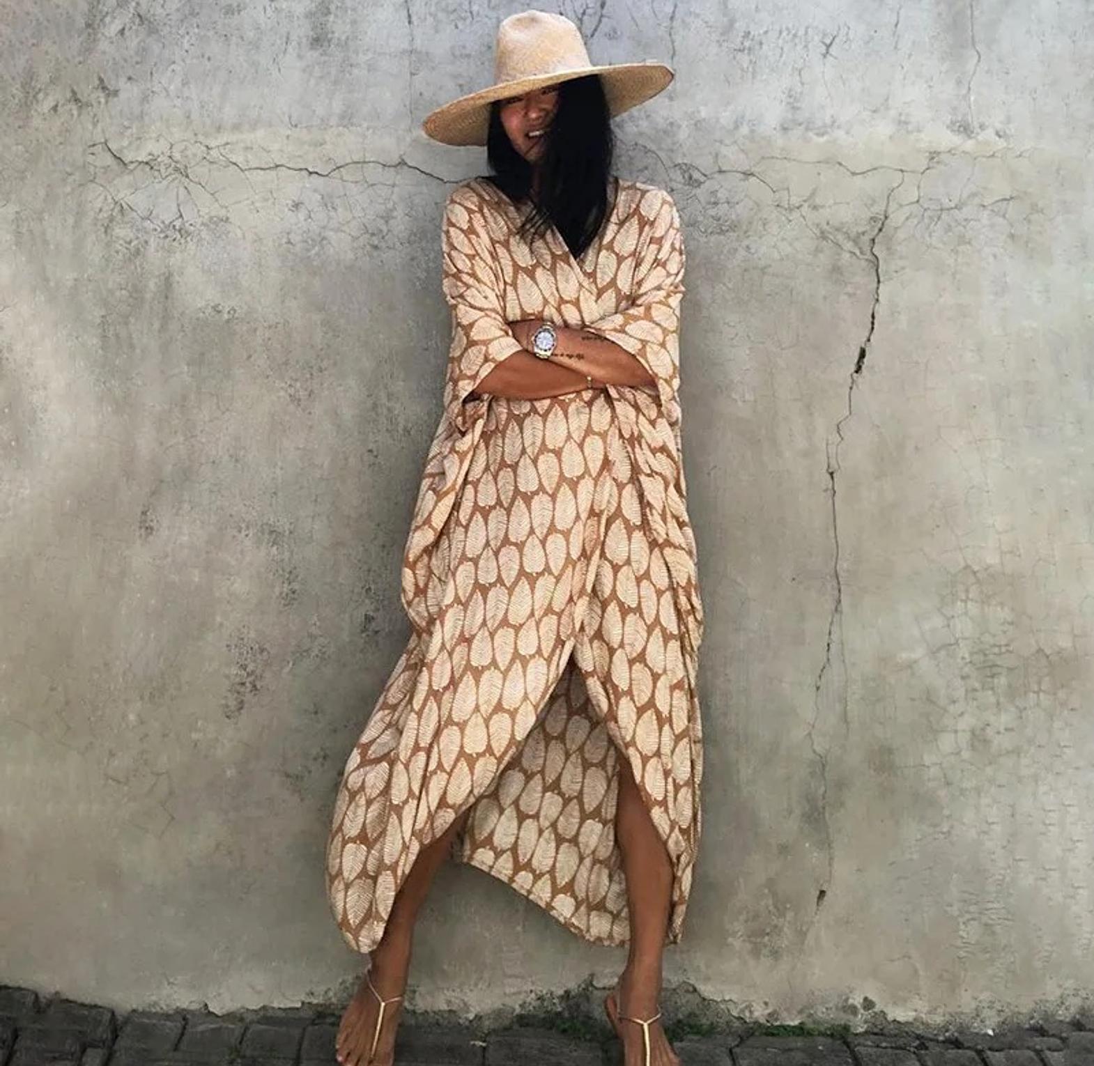 Stay cool and stylish under the sun with this half-sleeve leaf pattern bikini cover-up, crafted from lightweight, breathable cotton fabric ideal for hot summer days. Designed with a flattering lace-up front and relaxed fit, it slips effortlessly over your swimwear while offering comfort and protection against the sun. The tropical leaf print brings out that beachy, resort-ready vibe, making it a perfect companion for poolside lounging, seaside walks, or casual beach bar visits. Whether you're traveling or enjoying a staycation, this cover-up blends function with feminine flair—an essential layer that lets your swimsuit shine while keeping you comfortably covered.