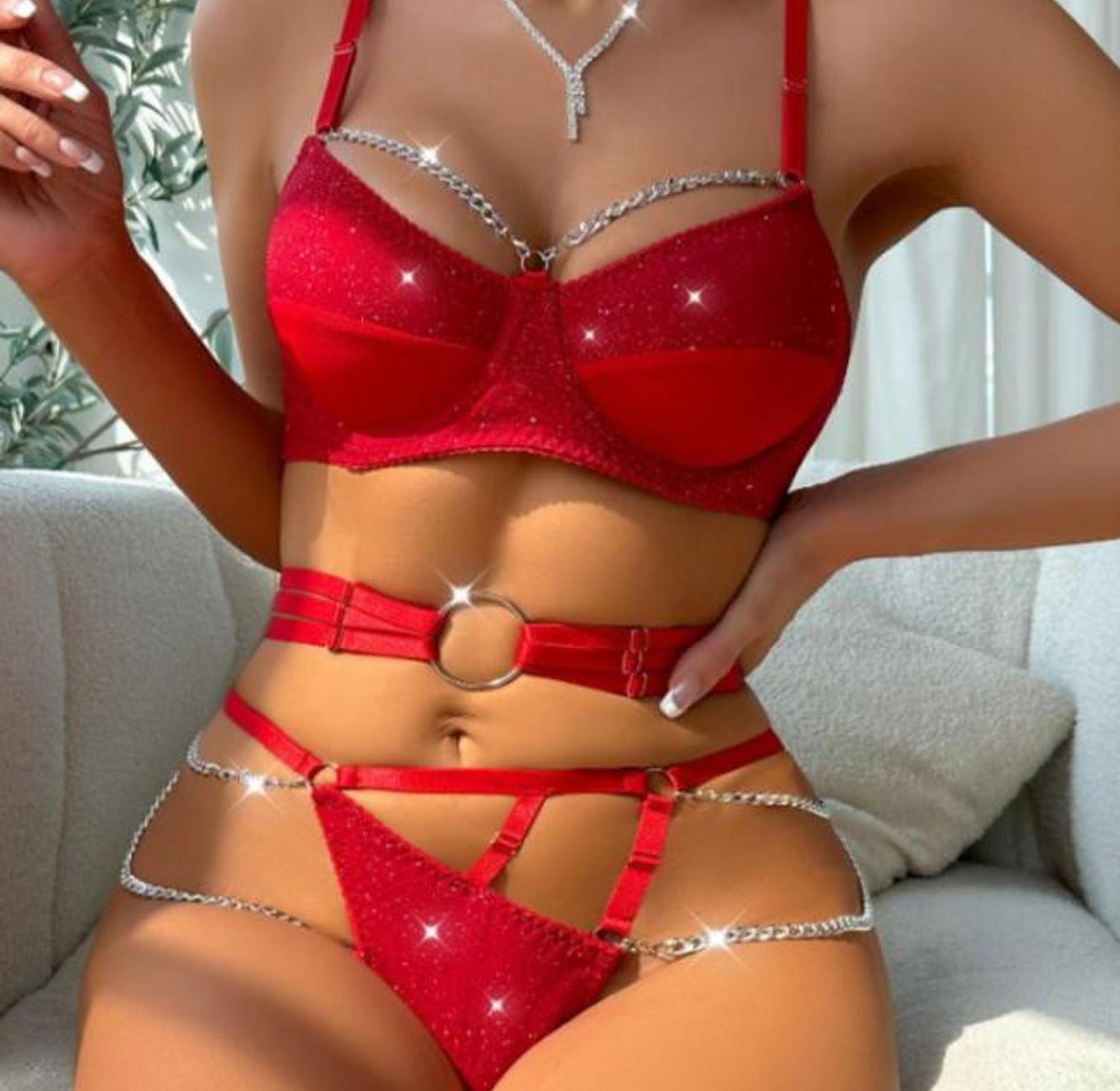 Unleash high-impact glamour with this Hollowed-Out Network Red Shiny Silver Lingerie Set, a three-piece ensemble that blends futuristic edge with sensual elegance. Featuring a bold hollowed mesh bra, matching high-cut briefs, and a coordinating accessory piece, this set is detailed with reflective silver accents that catch the light with every movement. The intricate openwork design offers a seductive glimpse of skin, while the fiery red hue adds passion and power to the look. Perfect for club nights, private showings, or confident self-expression, this set is a true fusion of sparkle, structure, and raw erotic energy.