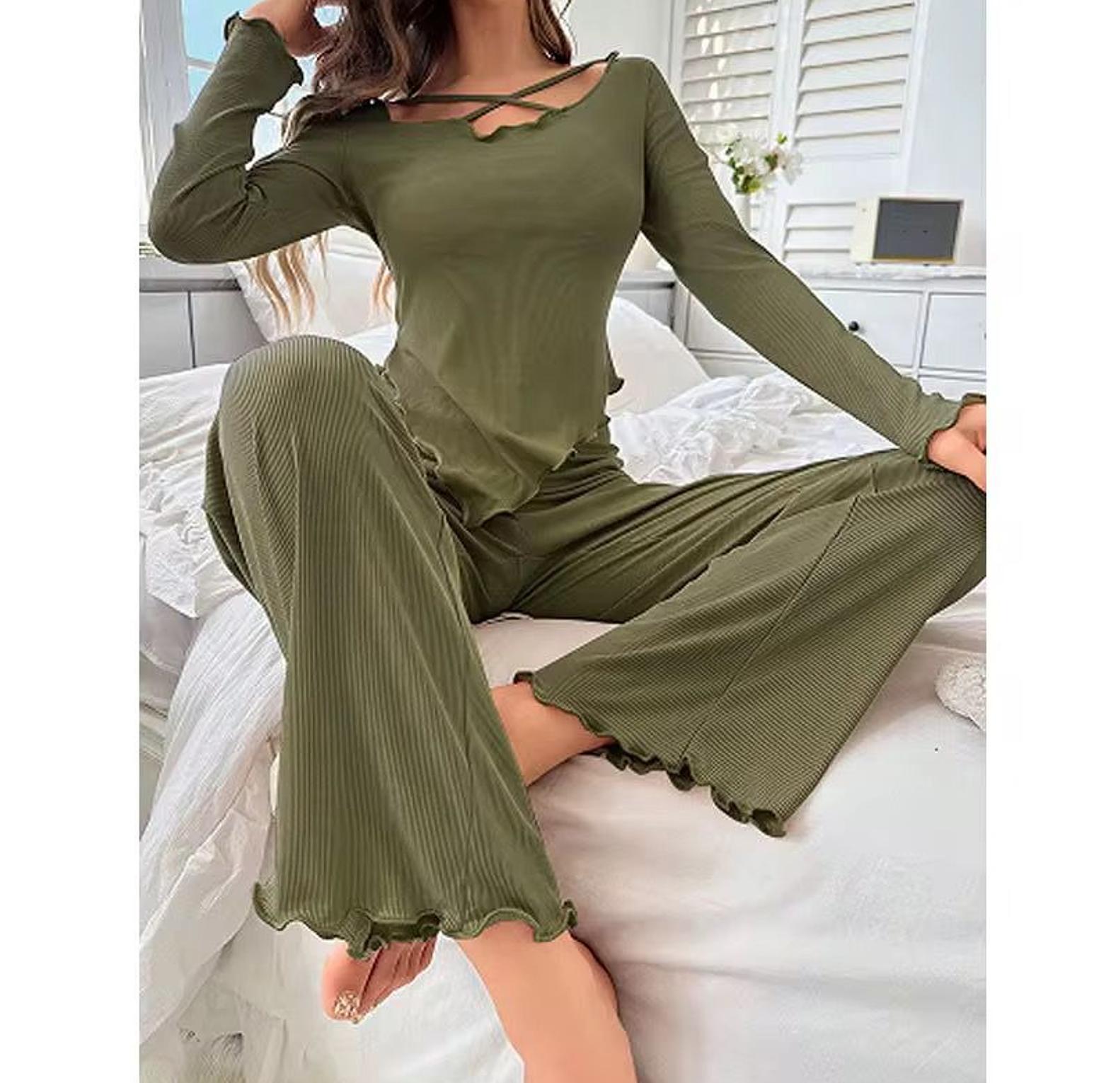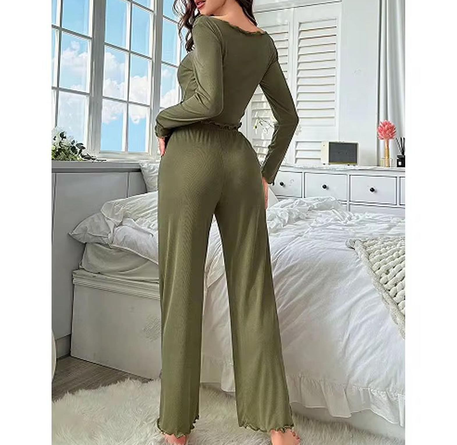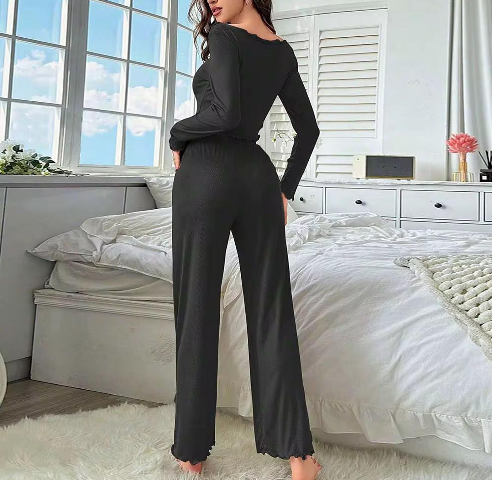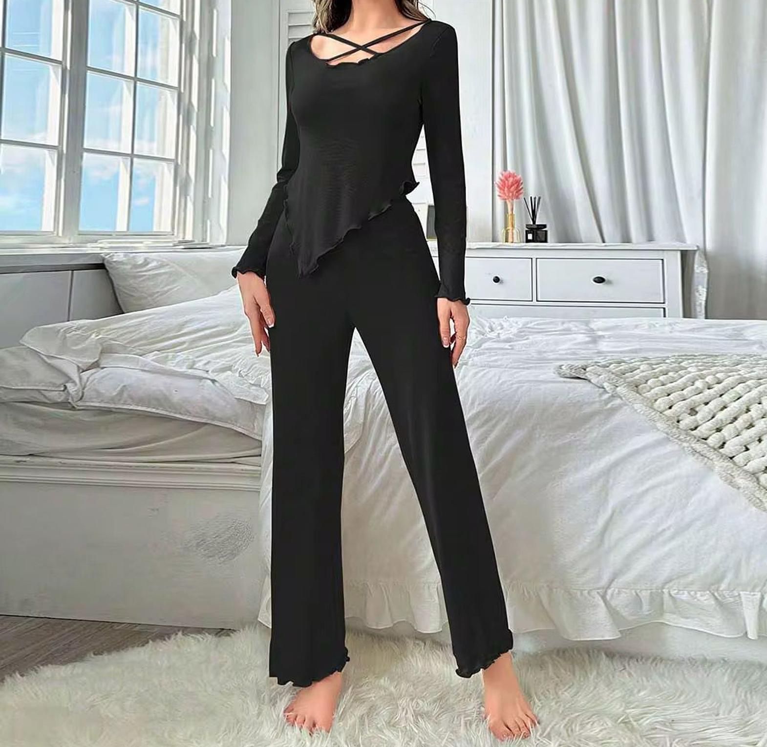 Upgrade your loungewear with this Irregular Long-Sleeved Shirt Pajama Set, designed for comfort without compromising on style. The standout feature is the wavy-cut solid color top, with an asymmetrical hemline and soft, flowing sleeves that give a modern, fashion-forward twist to classic sleepwear. Paired with matching trousers, the set offers a relaxed fit ideal for cozy nights in, lazy weekends, or even a calm evening on the balcony with a book in hand. Crafted from soft, breathable fabric, it ensures ease of movement and all-night comfort. Whether you're unwinding after a long day or just enjoying a slow morning, this two-piece set adds elegance and personality to your at-home wardrobe.