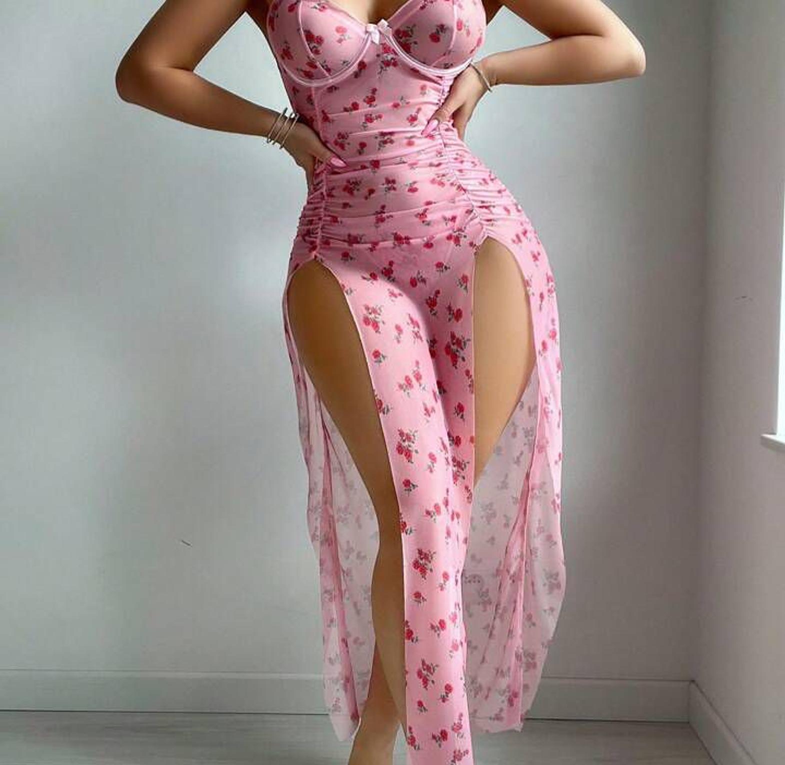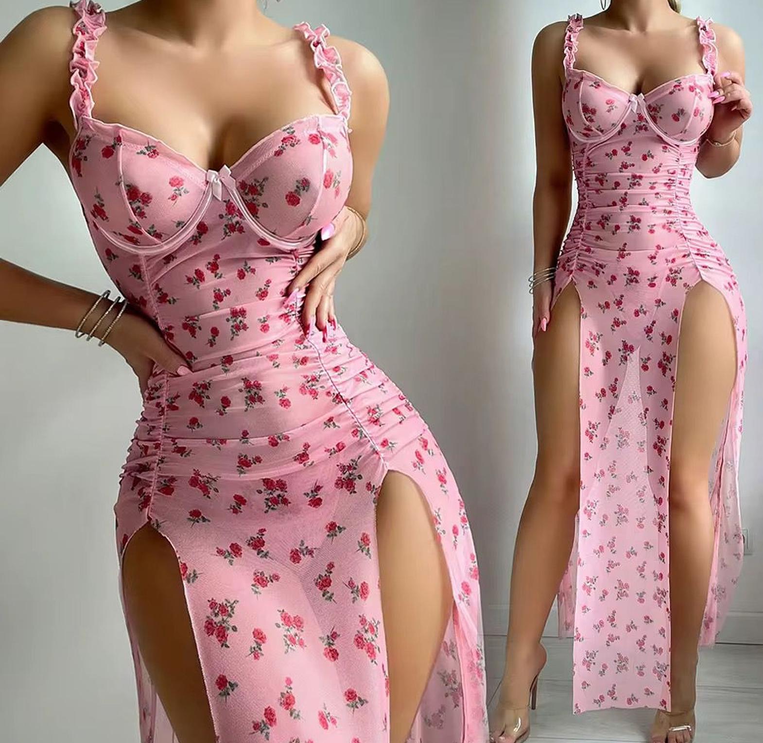 Bold yet beautifully feminine, this fashion lingerie dress combines structured detail with delicate design. Crafted from sheer mesh embroidered with floral patterns, it offers a sultry, body-revealing look while maintaining a touch of elegance. The underwire cups provide subtle lift and shape, enhancing the bust with support and confidence. Pleated detailing adds graceful texture, while a high side slit introduces just the right amount of edge and movement. Whether worn for romantic occasions or bold self-expression, this piece is more than lingerie it’s a fashion statement that celebrates curves, confidence, and style. Ideal for the woman who isn’t afraid to own the room, even in the bedroom.