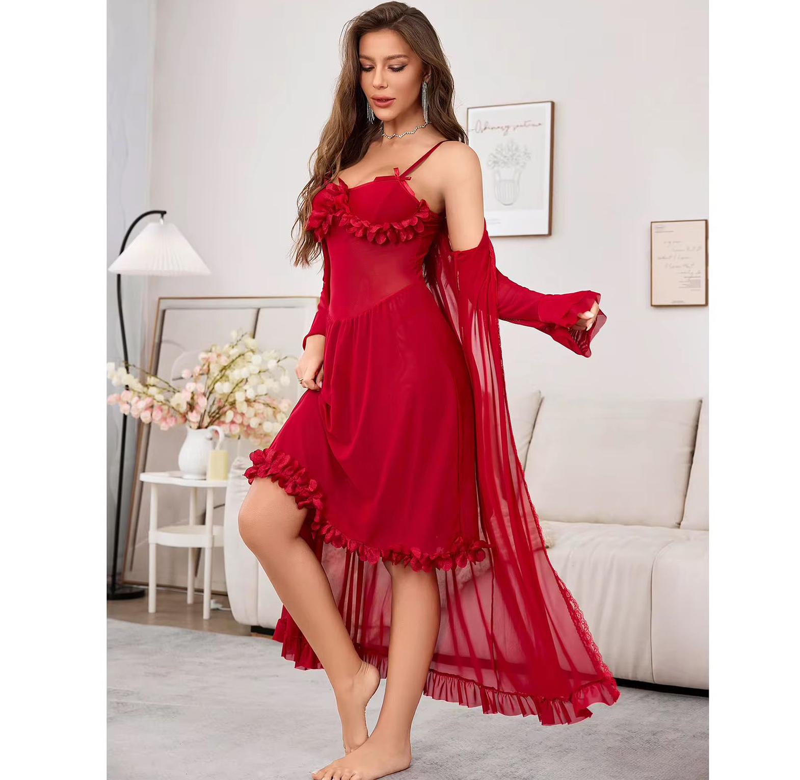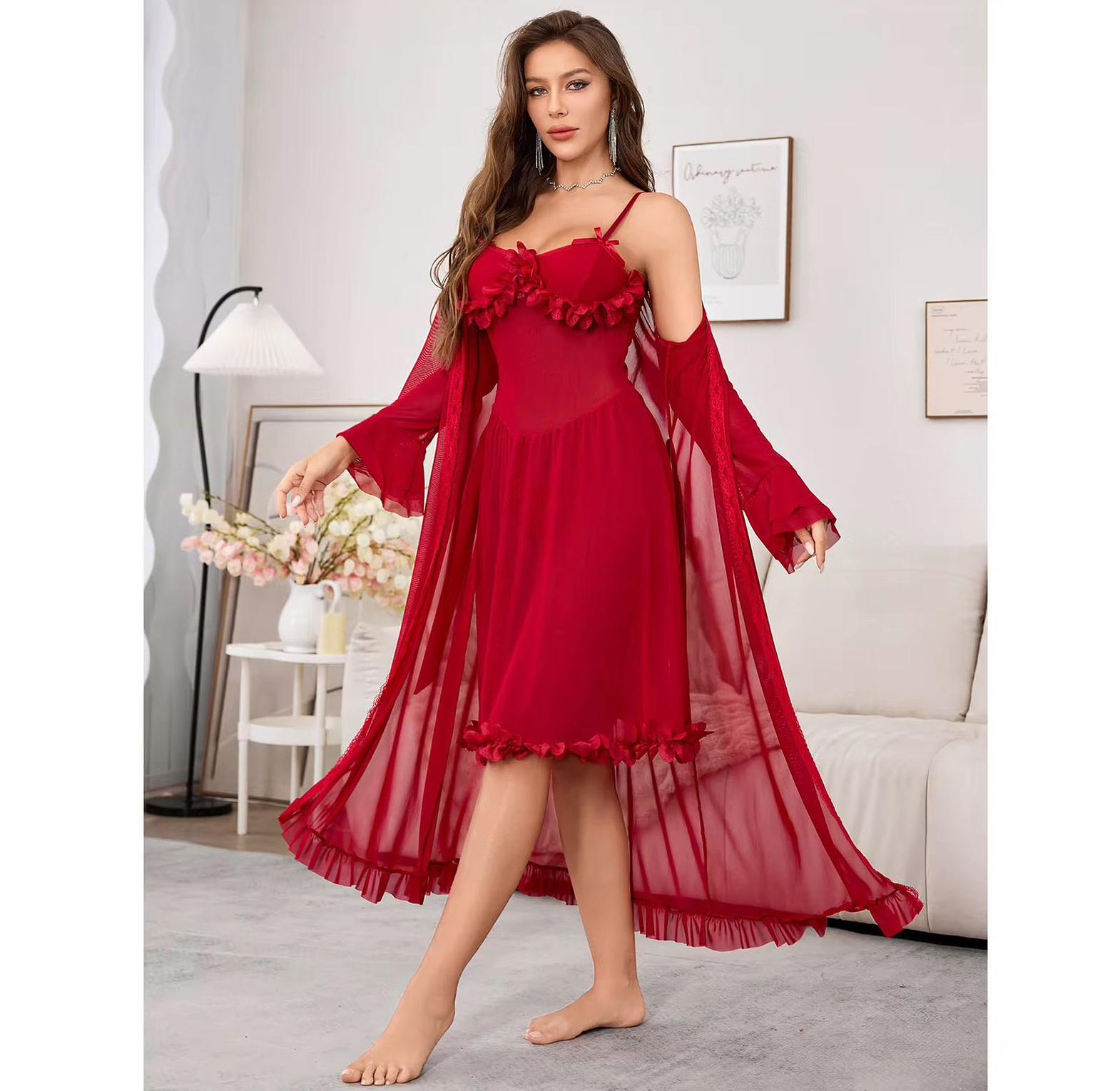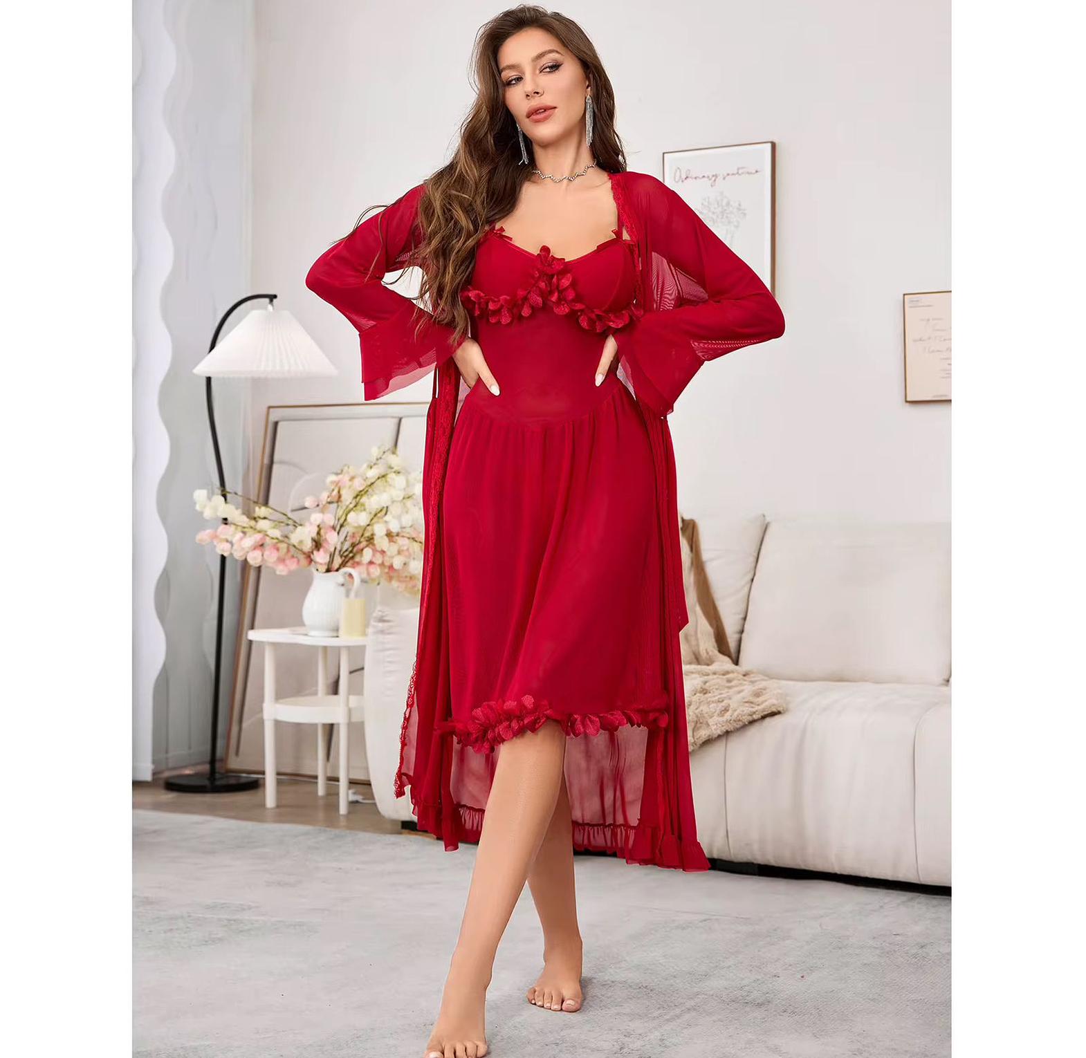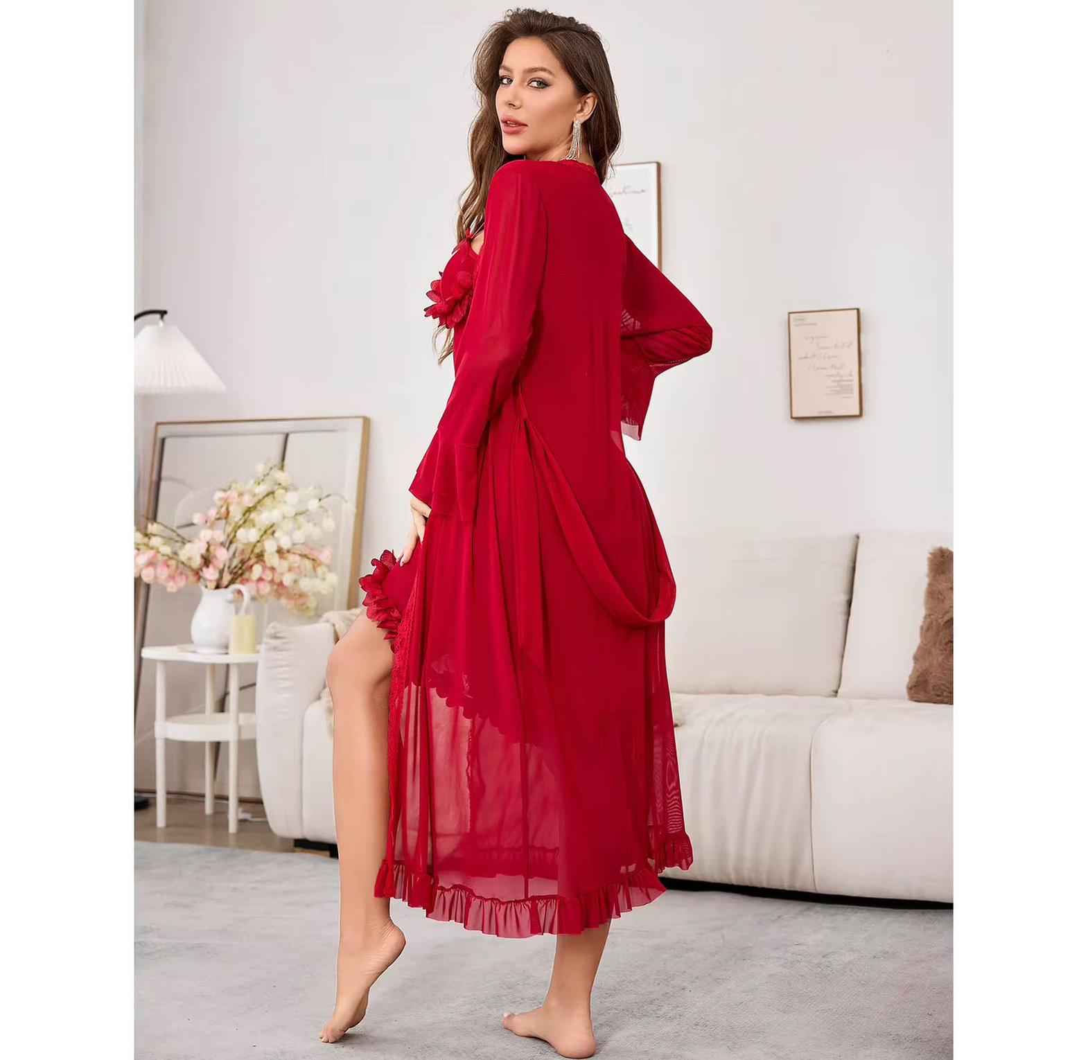 This mesh see-through long nightgown is a bold yet graceful statement piece, crafted for women who appreciate luxury with a seductive edge. Made from lightweight, breathable mesh, it flows effortlessly down the body, offering a soft, teasing transparency that highlights the natural form. The standout trumpet sleeves add a vintage-inspired flair, flaring gracefully at the wrists for a touch of drama and femininity. Ideal for special evenings, intimate settings, or simply lounging in refined comfort, this gown delivers both comfort and captivating presence. Whether paired with delicate lingerie or worn solo, it embodies timeless glamour and modern sensuality in one unforgettable silhouette.