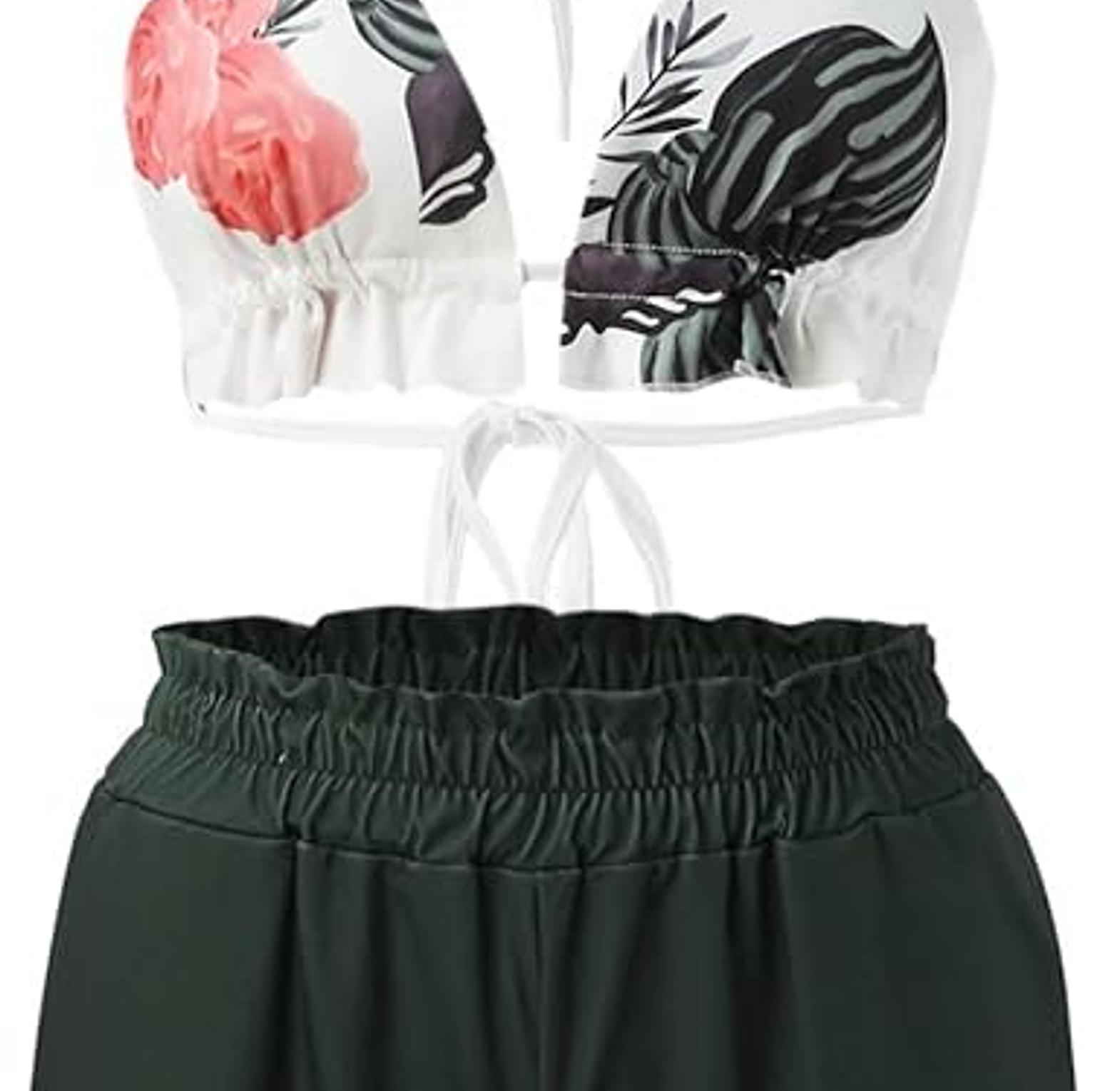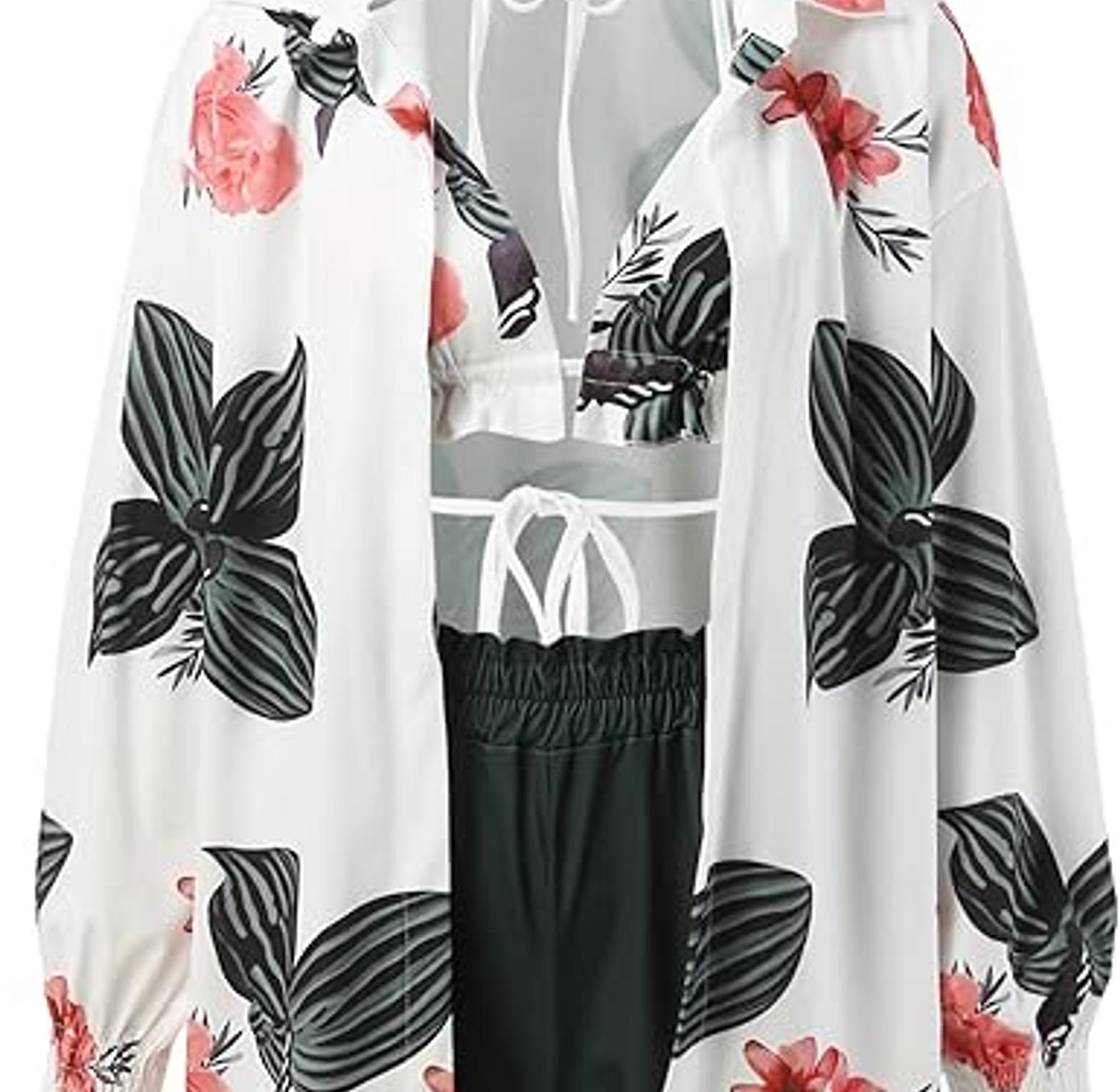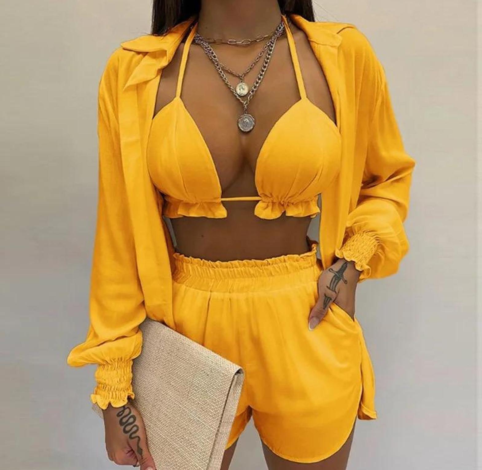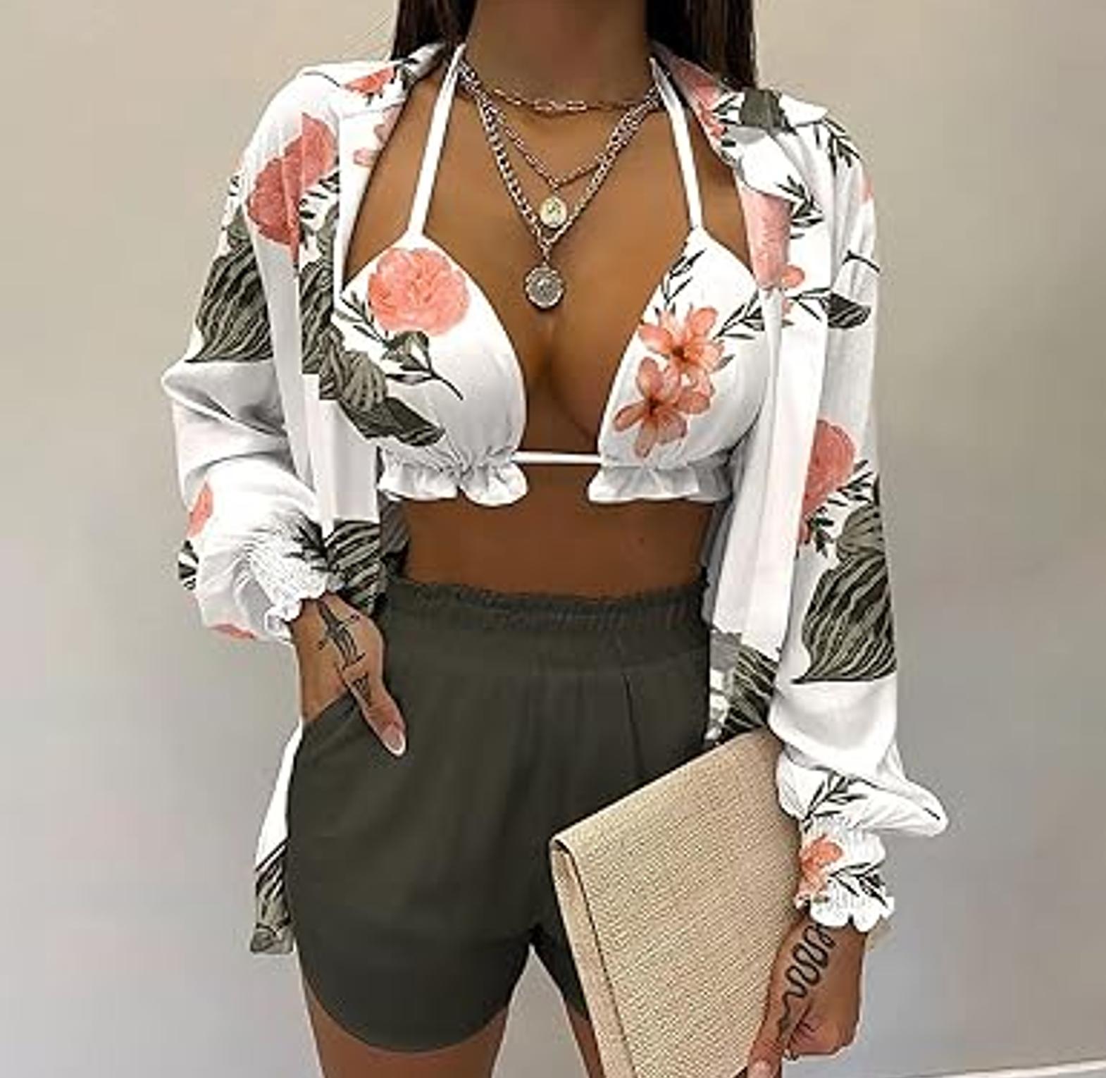 Designed for women who love bold style with a touch of playful charm, this 3-piece tropical print set is the ultimate warm-weather outfit. The set includes a fitted crop top that flatters the figure, a breezy balloon-sleeve shirt that adds drama and sun coverage, and a pair of coordinating shorts for a complete, carefree look. Whether worn as a cute swimwear cover-up, a vacation outfit, or casual daywear with flair, the vibrant tropical print brings out the spirit of summer. Lightweight and breathable, it's perfect for beach getaways, pool parties, or just turning heads on a sunny day. Fun, sexy, and effortlessly stylish, this set is a must-have for any woman who wants comfort without compromising confidence.