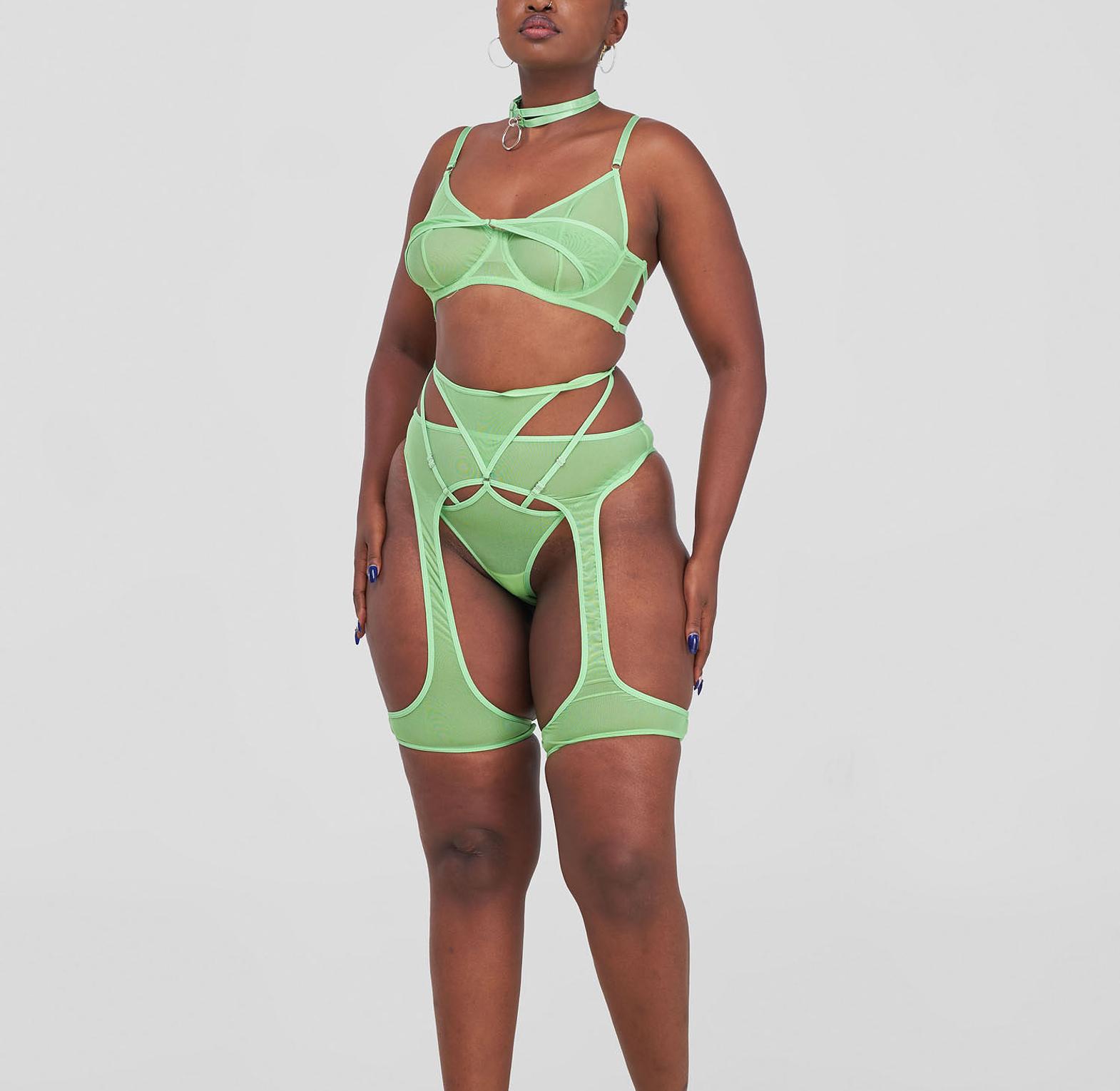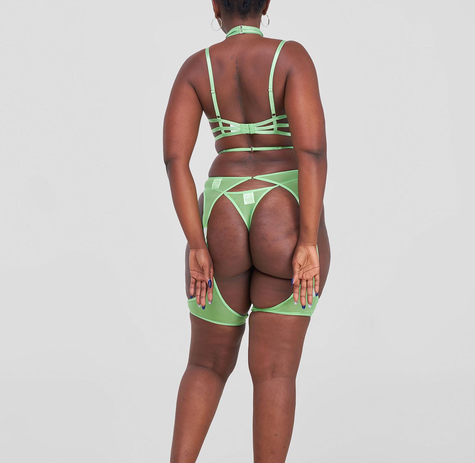 A daring green strappy lingerie set designed to frame your curves with bold lines and irresistible erotic energy.