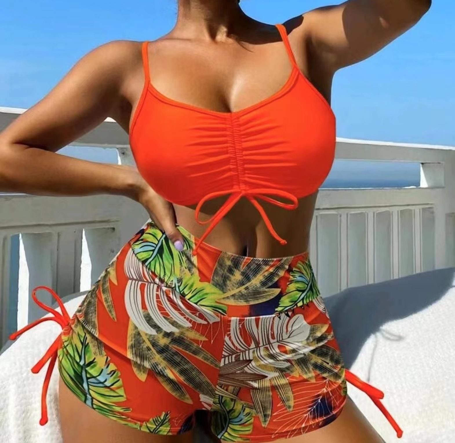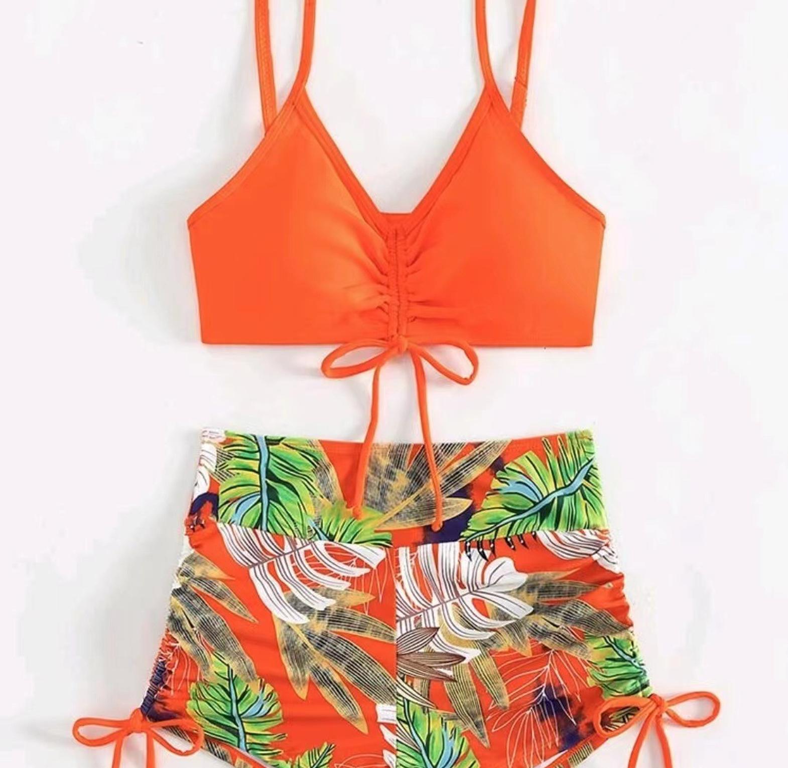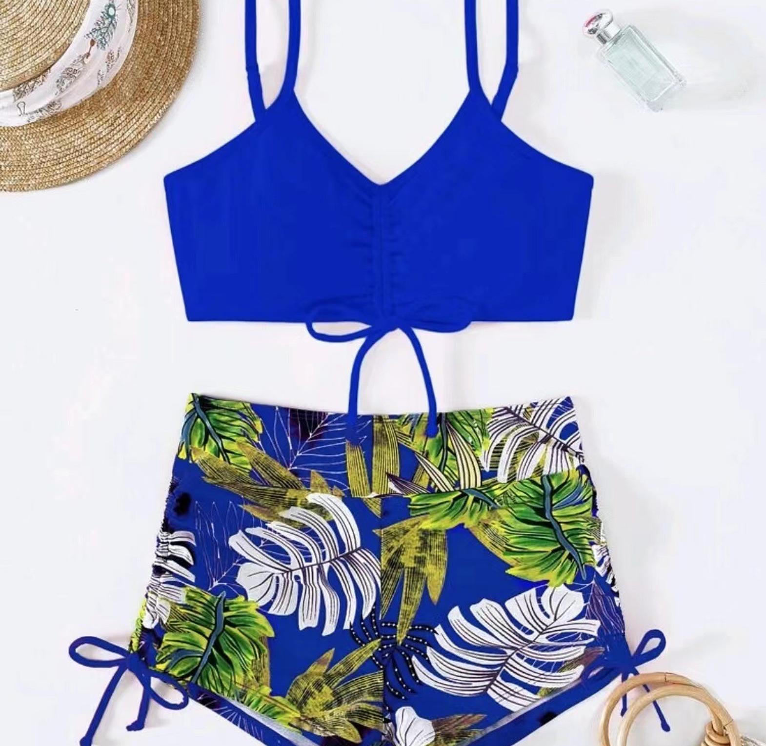 This tropical print bikini swimsuit features adjustable drawstring ties for a custom fit and bold island-inspired style perfect for beach days or poolside lounging.