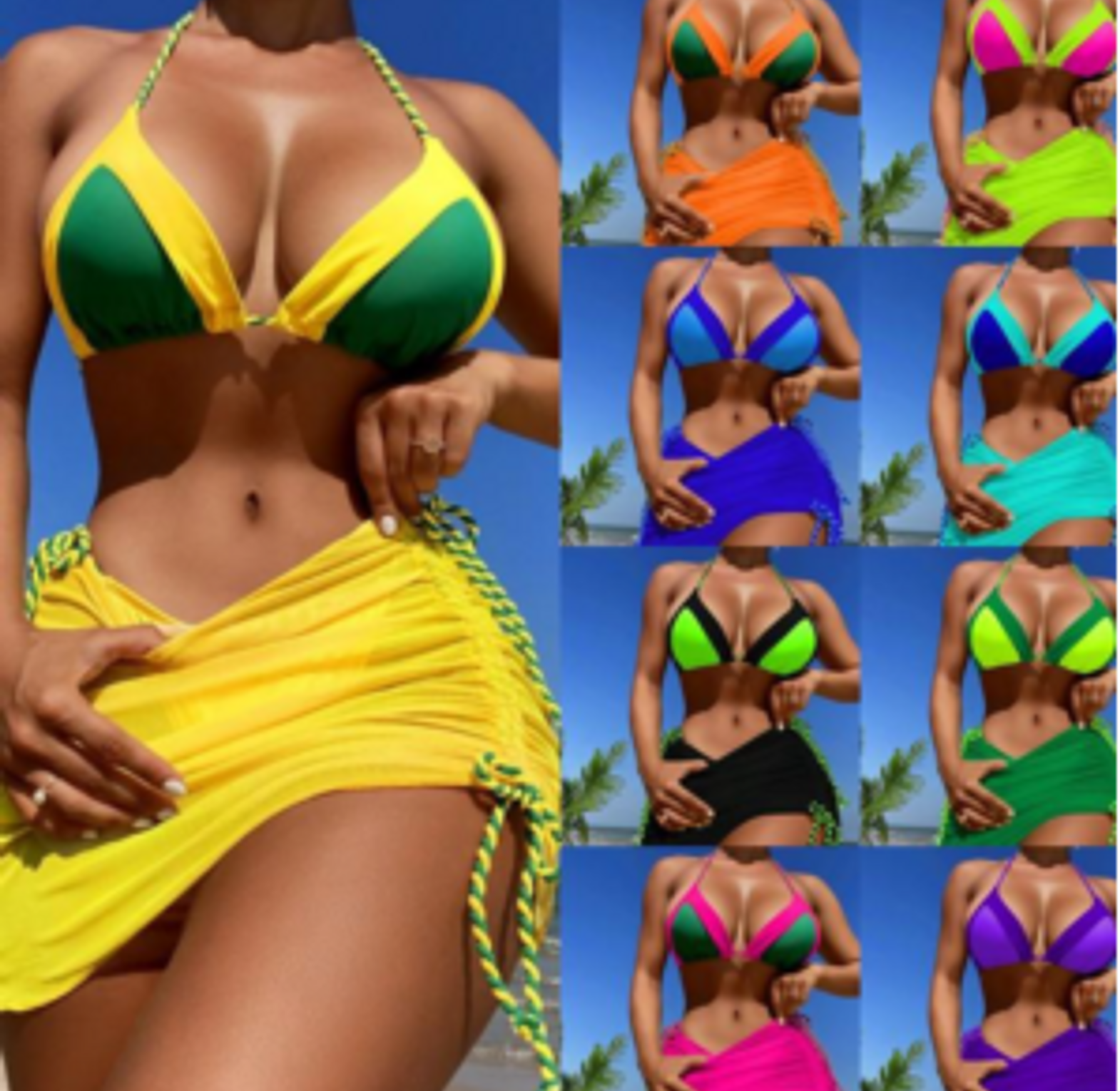 This bold 3-piece bikini set features a colorblock high-waisted thong, matching top, and a flirty drawstring cover-up skirt for a confident, head-turning beach look.