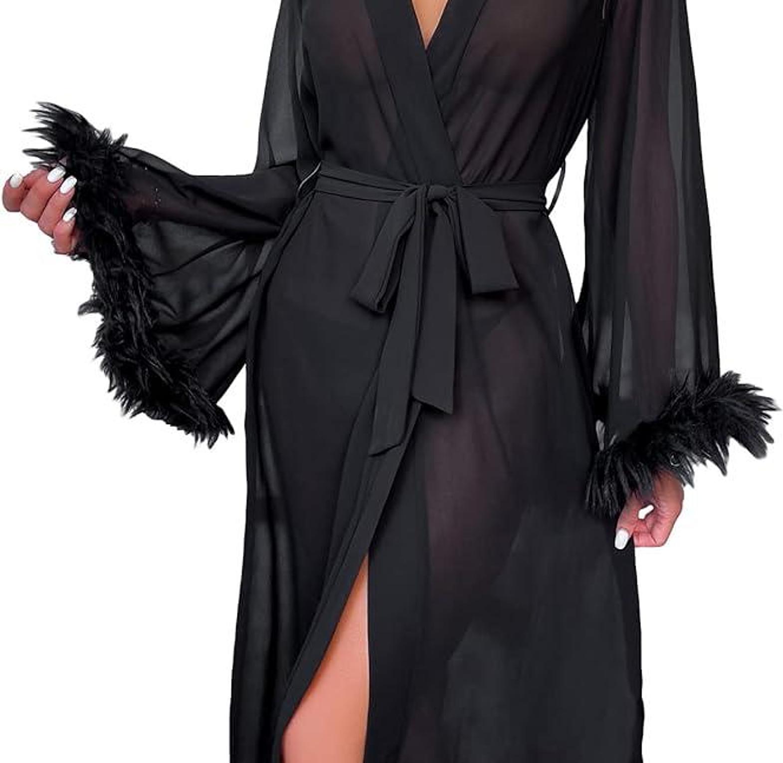 Wrap yourself in glamour with this Women’s Fuzzy Trim Long Sleeve Mesh Robe, a piece that effortlessly balances boudoir beauty and cozy elegance. Crafted from ultra-light, see-through mesh, it features long flowing sleeves trimmed in plush, feathery fuzz that adds a touch of vintage Hollywood charm. The adjustable waist belt cinches for a flattering silhouette, while the sheer fabric gently reveals your curves beneath—perfect for layering over lingerie or wearing solo for intimate evenings. Whether you’re preparing for a special night or simply treating yourself to soft luxury, this robe brings a sensual statement to your nighttime routine.