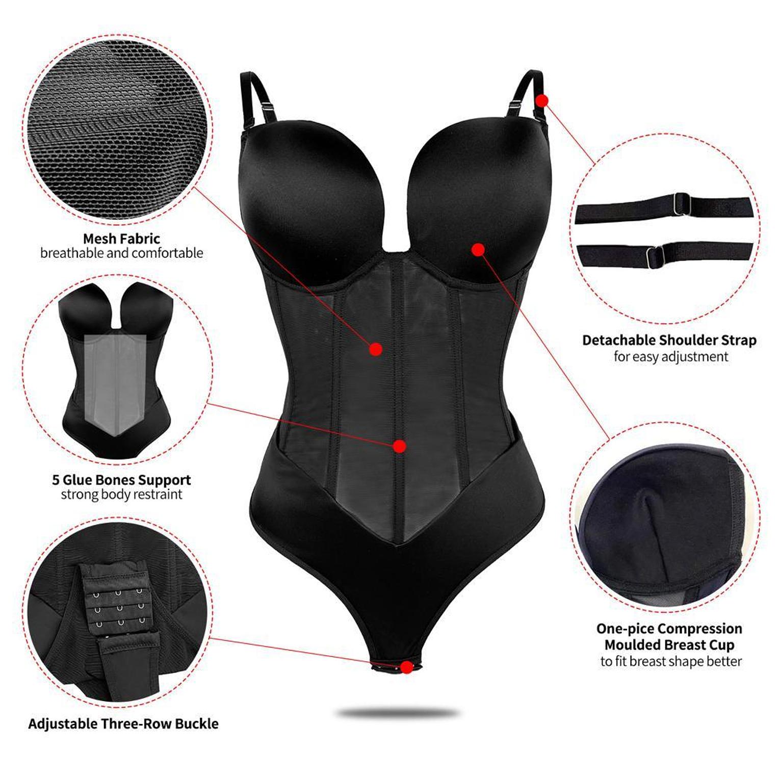 This backless plunge thong bodysuit shapewear is designed to slim the waist, lift the bust, and stay invisible under even the most daring outfits.