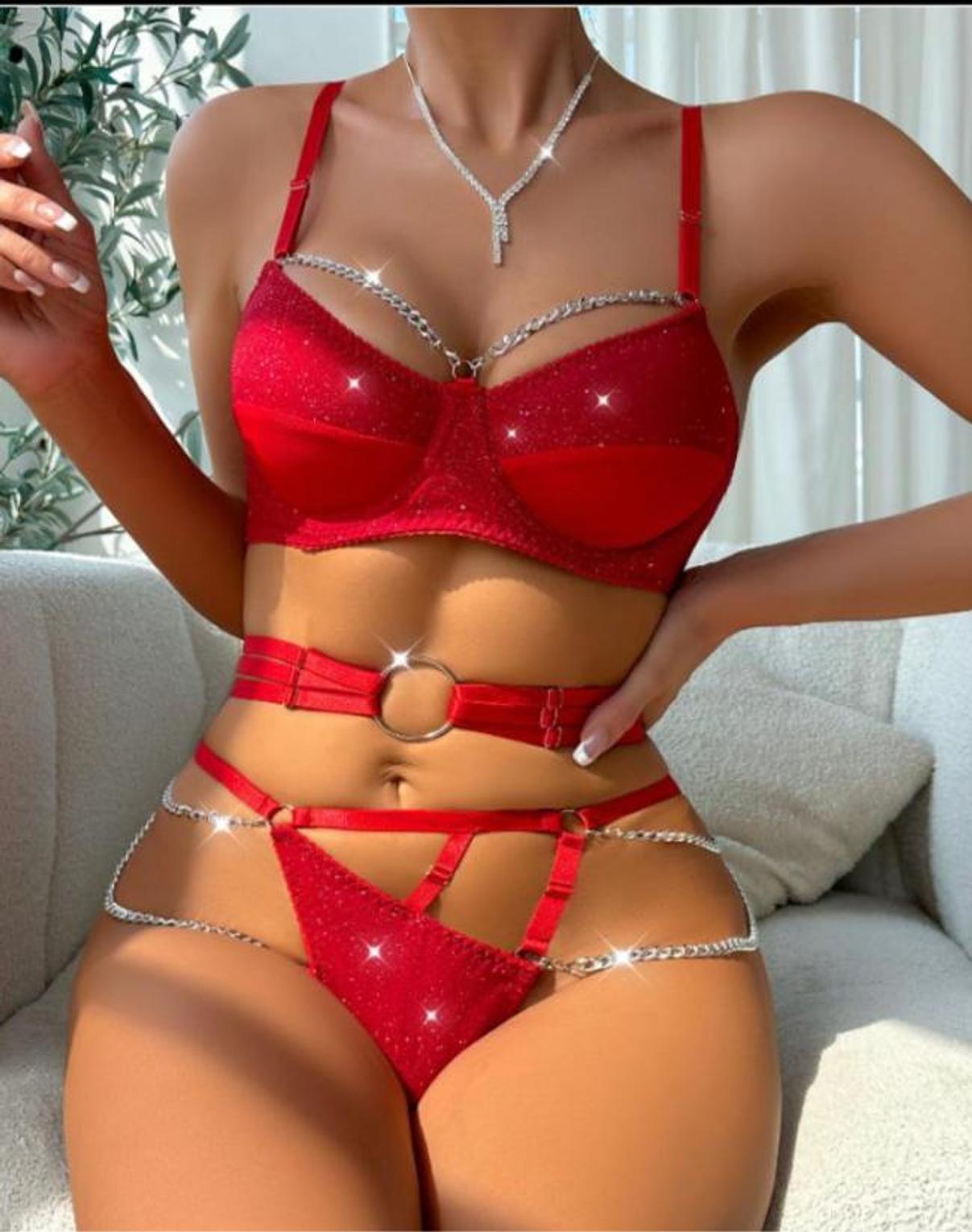 A daring three-piece set with red mesh and silver shine—made to shimmer, tease, and dominate attention.